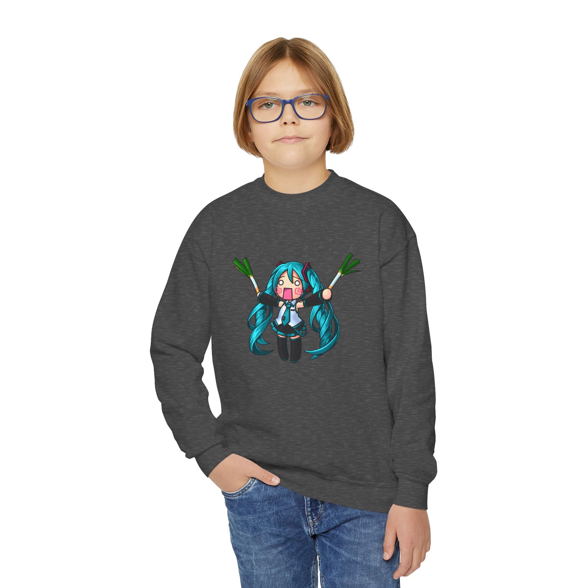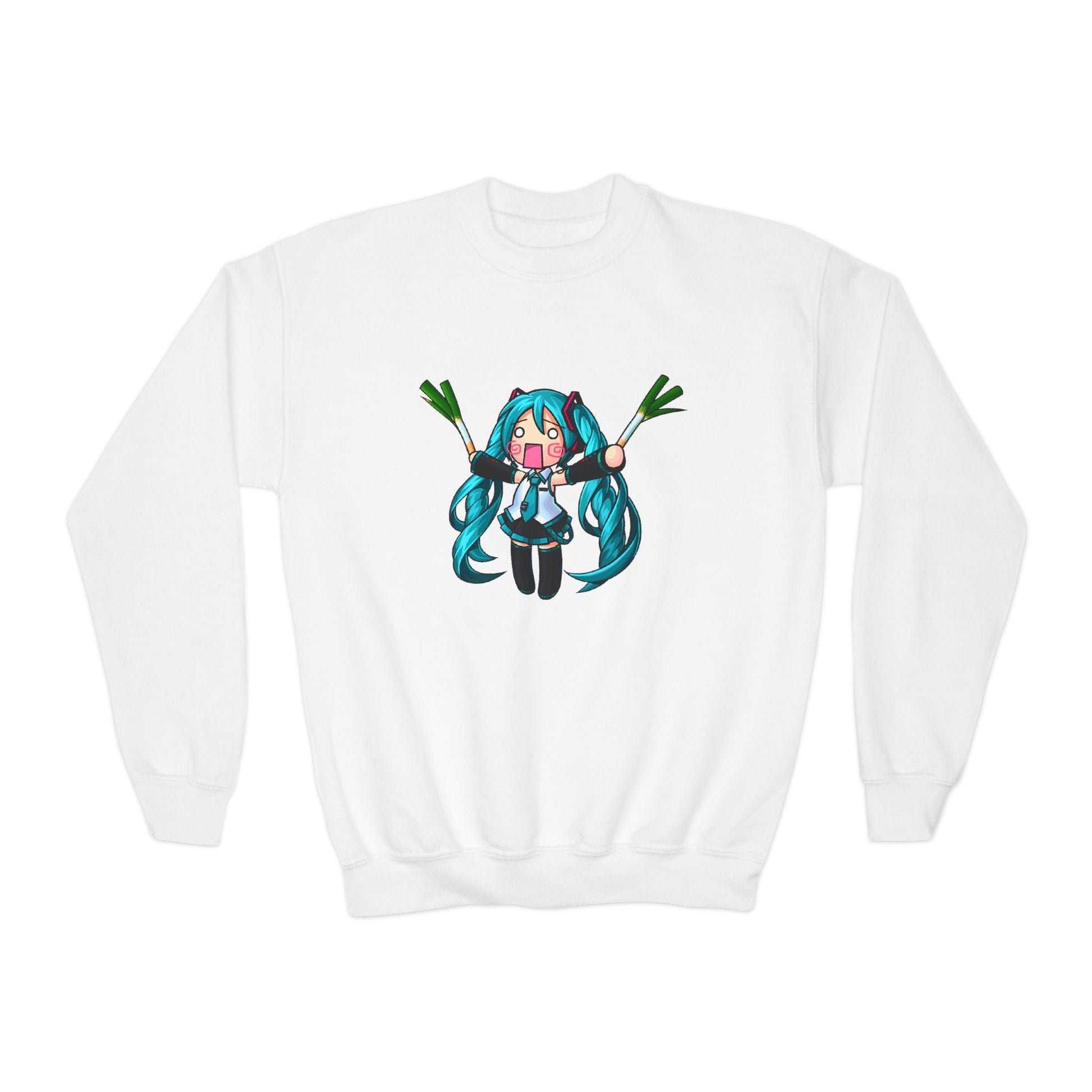 This youth crewneck sweatshirt brings a playful, anime-inspired vibe to everyday wear. Soft yet durable midweight fabric holds bright prints and embroidered details without losing shape. The loose, comfortable fit lets kids move freely — perfect for school days, weekend hangouts, and anime club meetups. The embroidered chibi character with teal twin-tails and little green onions feels spirited and joyful, adding personality to a simple white sweatshirt. Built with a ribbed collar and cuffs, tubular knit construction, and a tear-away label, it’s made to last through washes and adventures while meeting strict safety and compliance standards. Product features - 50/50 cotton-poly medium-heavy fabric (8.0 oz/yd²) — durable and smooth for printing - Tubular knit (no side seams) for reduced waste and cleaner fit - Ribbed knit collar and cuffs retain shape and stretch - Loose fit with tear-away label — comfortable for kids - Embroidery option on left or center chest; safety compliant (formaldehyde, lead, cadmium, phthalates, flammability) Care instructions - Machine wash: cold (max 30C or 90F) - Non-chlorine: bleach as needed - Do not tumble dry - Do not dry clean - Do not iron